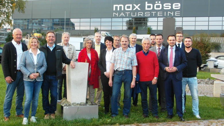 Heinz Böse erläuterte die umgesetzten Änderungen der Produktionsabläufe in der energetisch sanierten und erweiterten Produktionshalle. Für die Zuschnitte und kunstvollen Gestaltungen der Gesteinsblöcke stehen mächtige Maschinen und spezielle Steinmetzwerkzeuge zur Verfügung. Die Besucher waren zudem beeindruckt von den tageslichthellen Arbeitsplätzen mit dem unverstellten Blick in die natürliche Umgebung. Die ansprechende Fassade im aparten Anthrazit und das neue silbern glänzende Firmenlogo „max böse NATURSTEINE“ ist sehr innovativ und lässt sich von weitem gut erkennen.